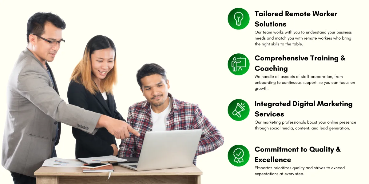 At Ekspertoz, we specialize in connecting small and medium businesses with remote professionals uniquely tailored to fit your needs. Our staff undergo comprehensive training and coaching, ensuring they integrate seamlessly with your team and deliver measurable value from the start. From administrative support to full-fledged digital marketing, our services are designed to save you time, reduce costs, and enhance productivity—all while boosting your online presence.
